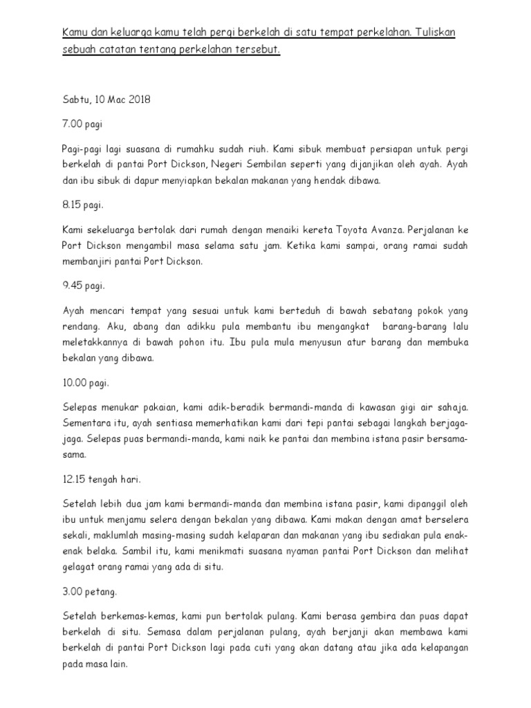 Pilih satu hari contoh Jumaat tarikhnya masa-masa nama tempat persiapan peralatan yang dibawa siapa yang ikut serta i. 12 April 2007 Pada hari Ahad yang lalu saya dan keluarga pergi berkelah di air terjun. Pada masa cuti sekolah yang lalusaya telah pulang ke kampung bersama keluarga sayaKampung saya terletak di MelakaKami bercuti di kampung selama tiga hari.