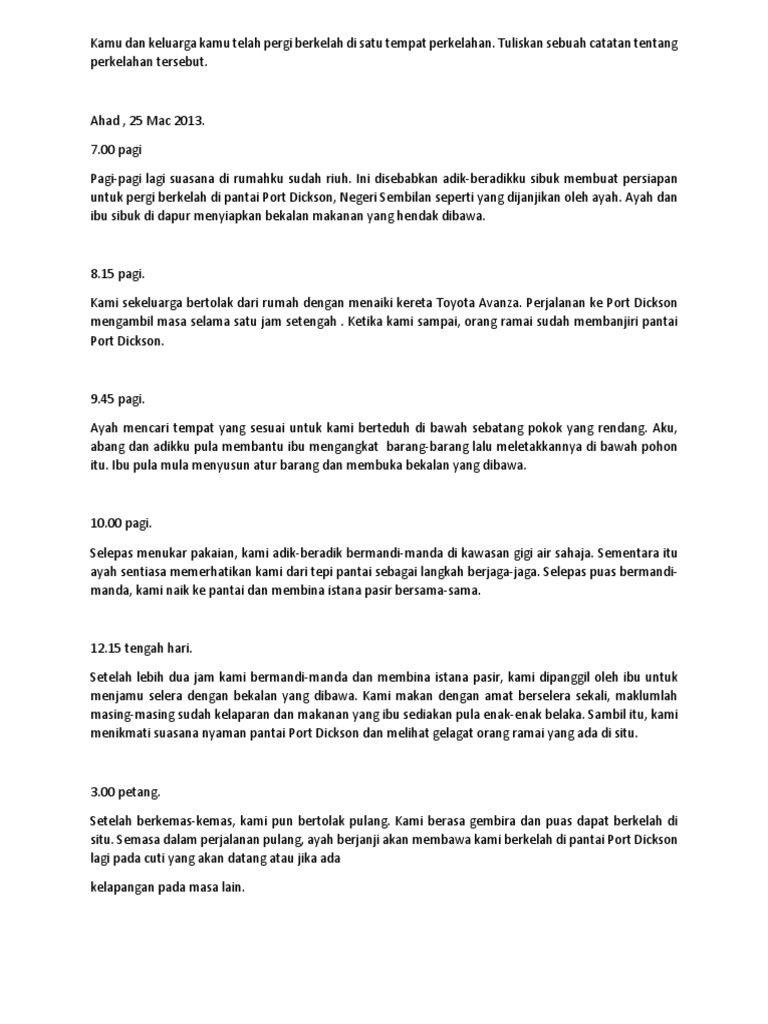 Pada cuti sekolah yang lalu bapa membawa kami sekeluarga pergi berkelah di Pantai Port Dickson yang terletak di Negeri Sembilan. Kalibata Utara II No84 Jakarta 12740 Tel. Setelah tiba di pantai port Dickson kami mendirikan khemah bersama-samakami menjamu selera sambil berbual-bual supaya dapat mengenali antara.